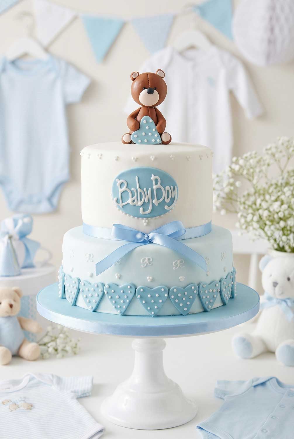 Maak kennis met onze prachtige babyshower taart voor jongens! Deze speciale taart is gemaakt met wit en blauw fondant en heeft een schattige handgemaakte beer bovenop. Met decoraties van royal icing en hartjes ziet hij er extra feestelijk uit. Deze luxe taart is perfect om de komst van een babyjongen te vieren. Bestel nu en maak je babyshower extra bijzonder met deze heerlijke en mooie taart!