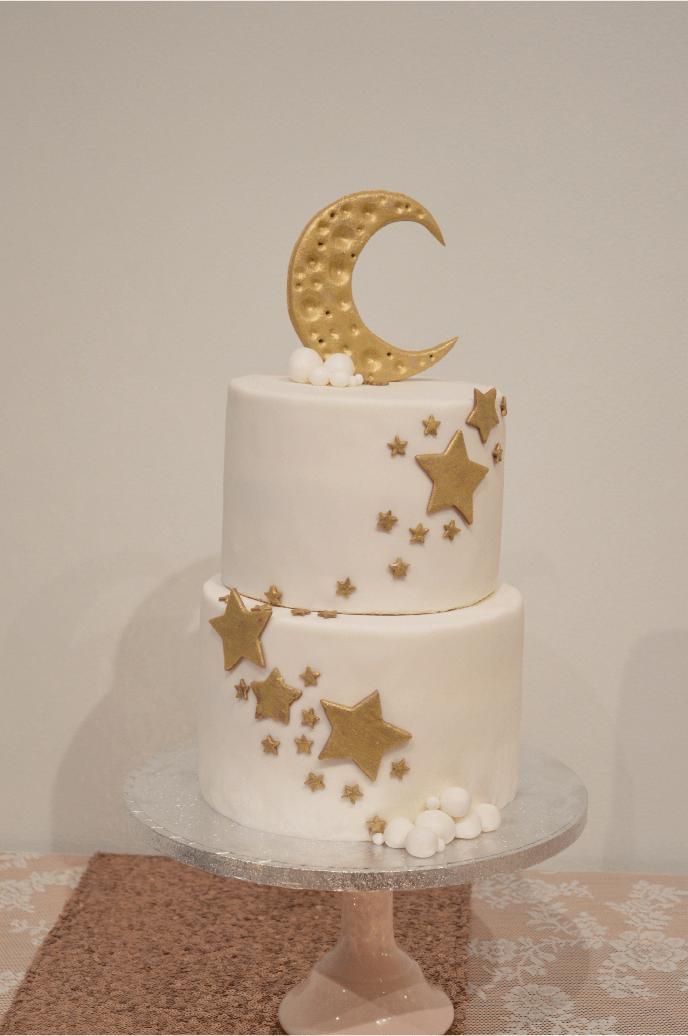 Maak kennis met de Babyshower sterren en maan taart. Deze prachtige blikvanger is met liefde en oog voor detail gemaakt. Taart van fondant en hangemaakte decoraties.