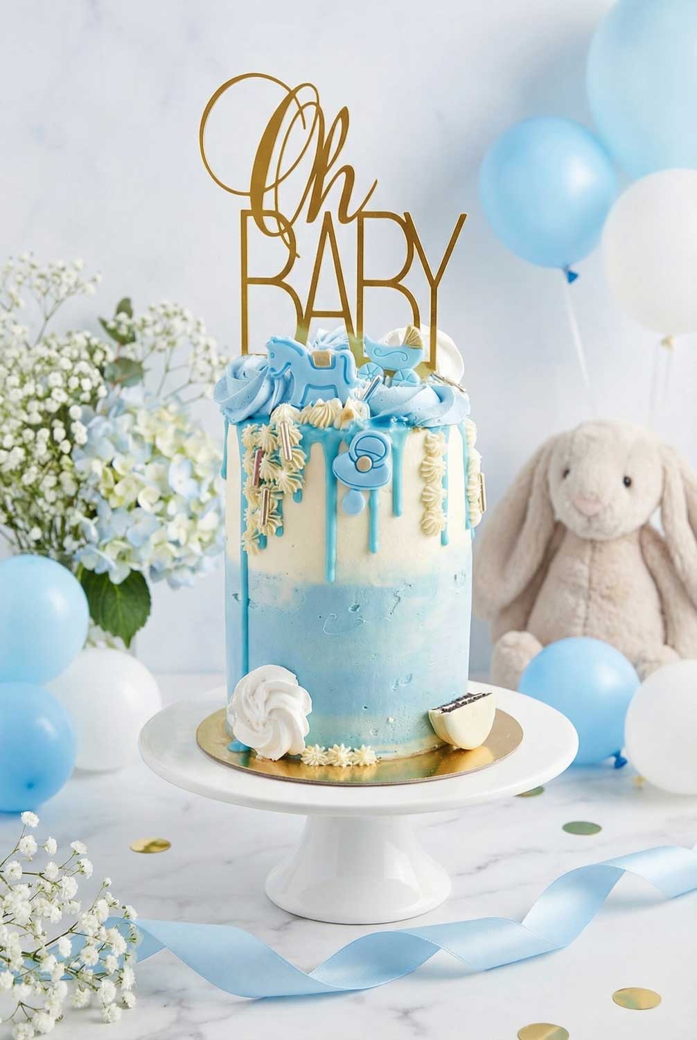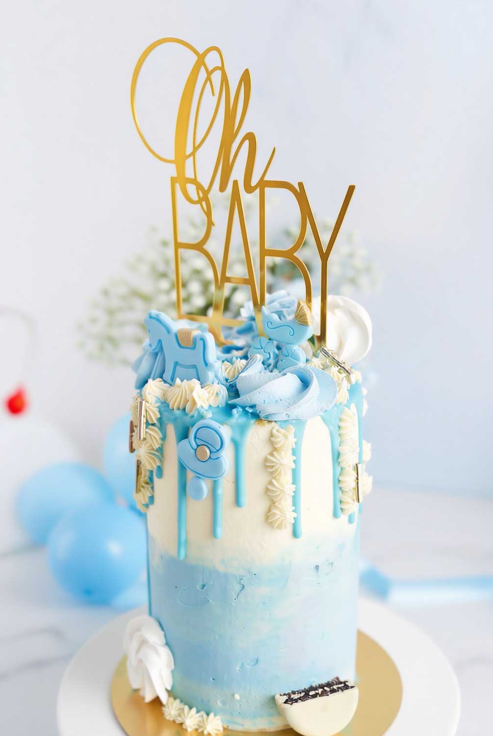 Met deze prachtige babyshower taart voor een jongen zal dit bijzondere moment een groot succes worden. De taart is afgesmeerd met heerlijk zachte botercrème in twee kleuren. Chocolade drip in baby blauw kleur en veel snoepjes maken hem extra feestelijk. Nog specialer maak je deze taart met een “Oh Baby” taart topper.