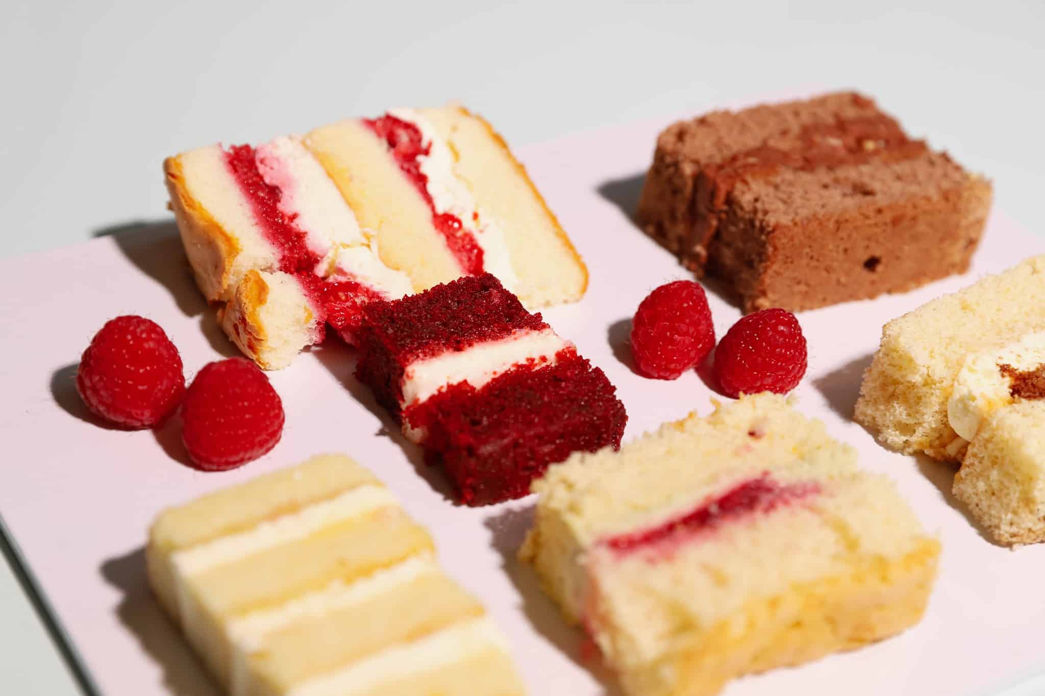 - Vanilla Strawberry: Luchtige vanille biscuit met aardbeien bavarois en stukjes donkere chocolade