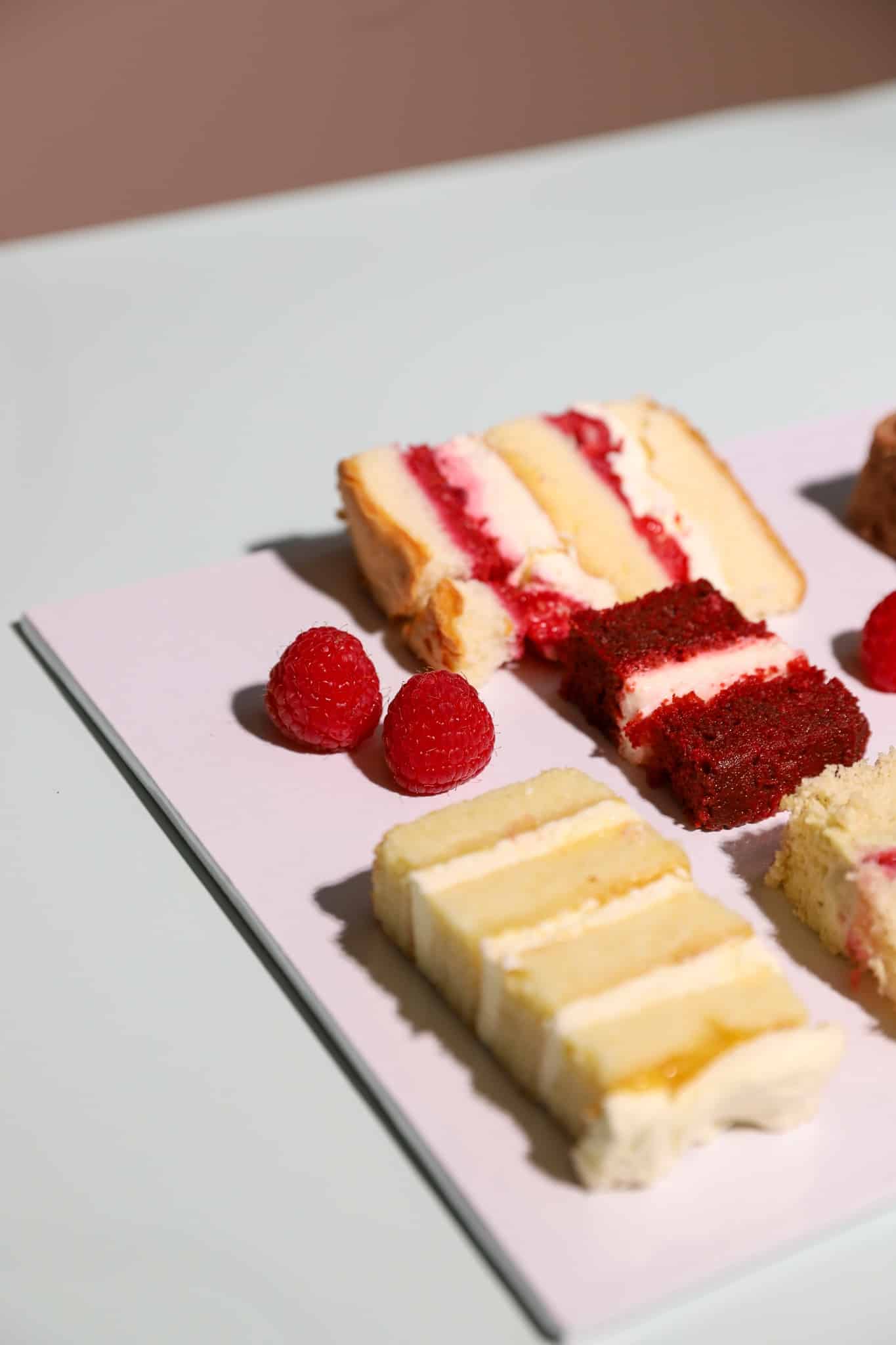 - Mascarpone & Raspberry:Â Luchtige vanille biscuit met mascarpone bavarois en verse stukjes frambozen