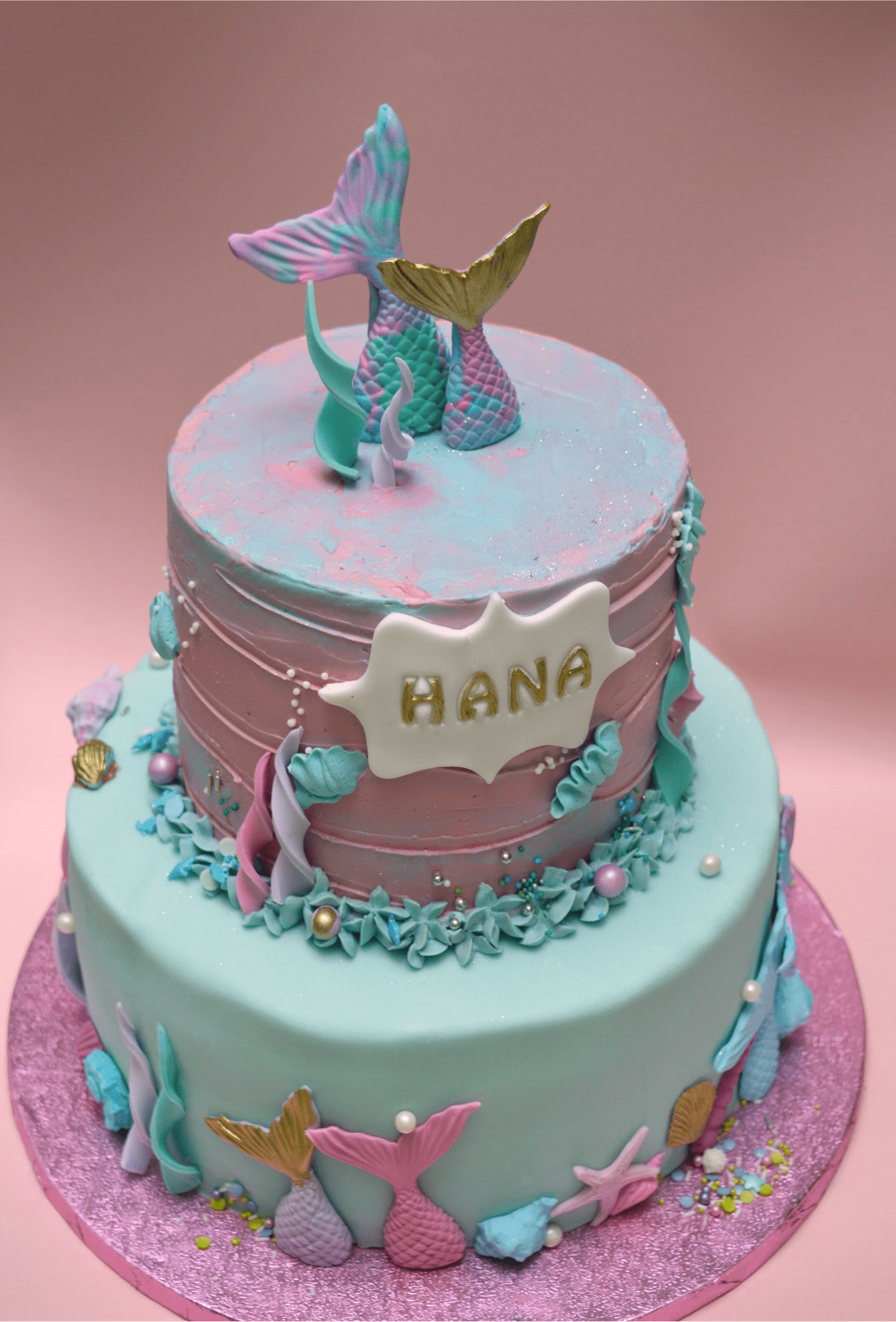 Versierd met prachtige, handgemaakte fondant schelpjes en een schitterende goudgeverfde zeemeerminstaart, is deze taart een prachtig en uniek kunstwerk dat elke gelegenheid zal doen stralen.